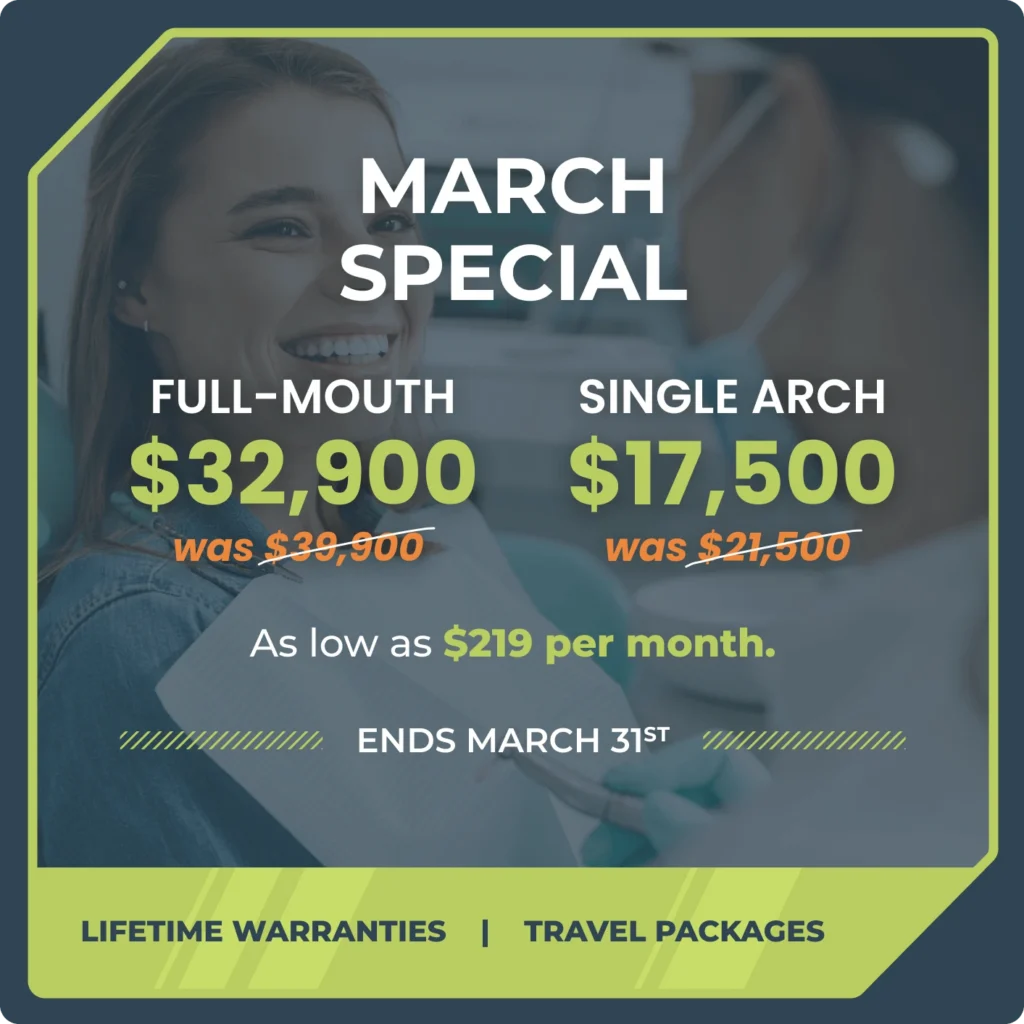 Until March 31, Done In One is offering special pricing on single and double zirconia arches (upper, lower, or both). Call today to schedule your free consultation and take advantage of this special offer.